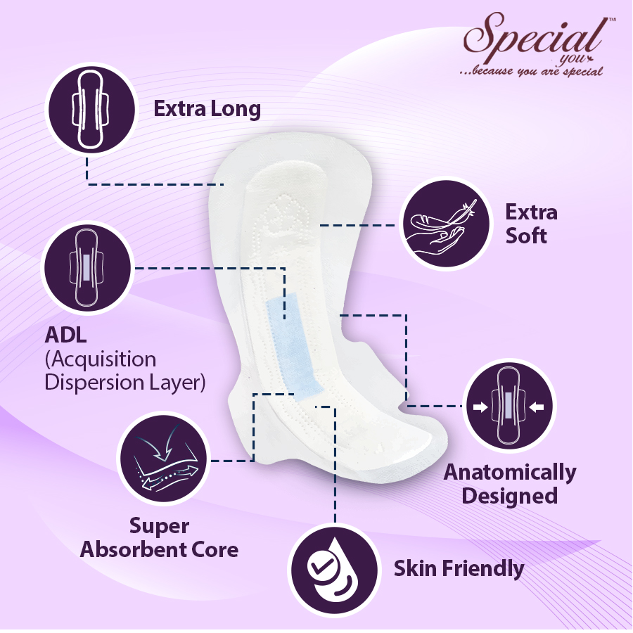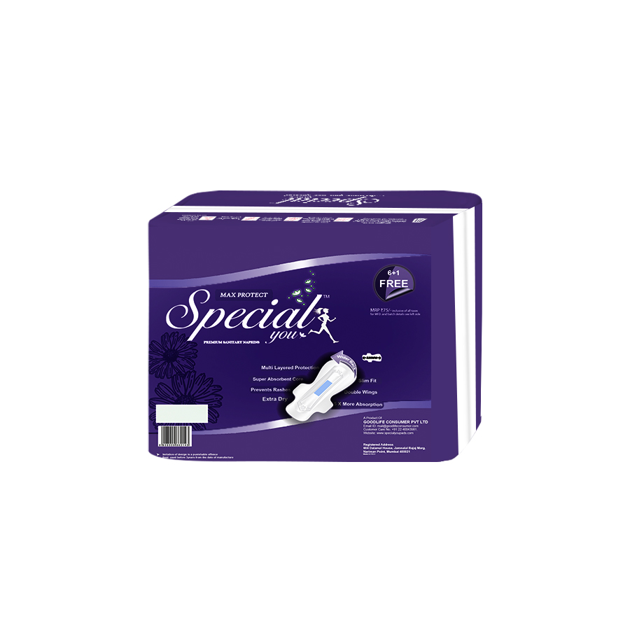 The Special You Max Protect sanitary napkin is ideal for ladies who want more protection and comfort during their period nights. With a length of 320 mm, this napkin is 10mm longer than standard napkins, providing enough covering.